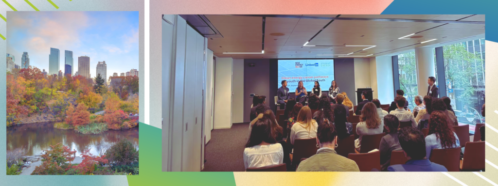 Student Energy was thrilled to host our very own event during New York Climate Week, in partnership with New Energy Nexus and Linked In, titled Clean Energy Career Pathways for Youth in the Global South. Drawing perspectives from Andrew Chang (Chief Growth Officer, New Energy Nexus), Hamd Akmal (Student, NYU), moderator Cammie Erickson (Senior Director of Social Impact, LinkedIn), and our very own Executive Director, Helen Watts, this event offered both inspiring and critical dialogue on the importance of engaging meaningfully with young people and providing them with necessary green skills and support to drive an inclusive and equitable clean energy transition, while also acknowledging the unique ways in which youth from the Global South are positioned to foster radical change.