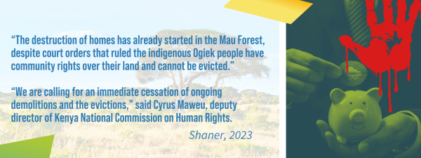 Shaner understands that this process is occurring anew as an unintended consequence of the rapidly expanding Carbon Market. Through the Carbon Market, governments and corporations are incentivized to engage in carbon capture, removal, and sequestration projects with the reward of huge profits and positive PR for acting “sustainably.” The ongoing eviction and expulsion of Indigenous Kenyan’s from their country’s forests is a clear example of how chasing carbon metrics for profit, without considering the impact on human rights, can have disastrous consequences.