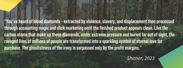 In late 2023, CounterPunch reporter Alexandria Shaner published an article titled “Blood Carbon: Kenyans are Being Erased so the UAE can Greenwash.” She begins by drawing a comparison between the historically well-publicized phenomenon of “blood diamonds” or “conflict diamonds.” The metaphor is apt and striking!