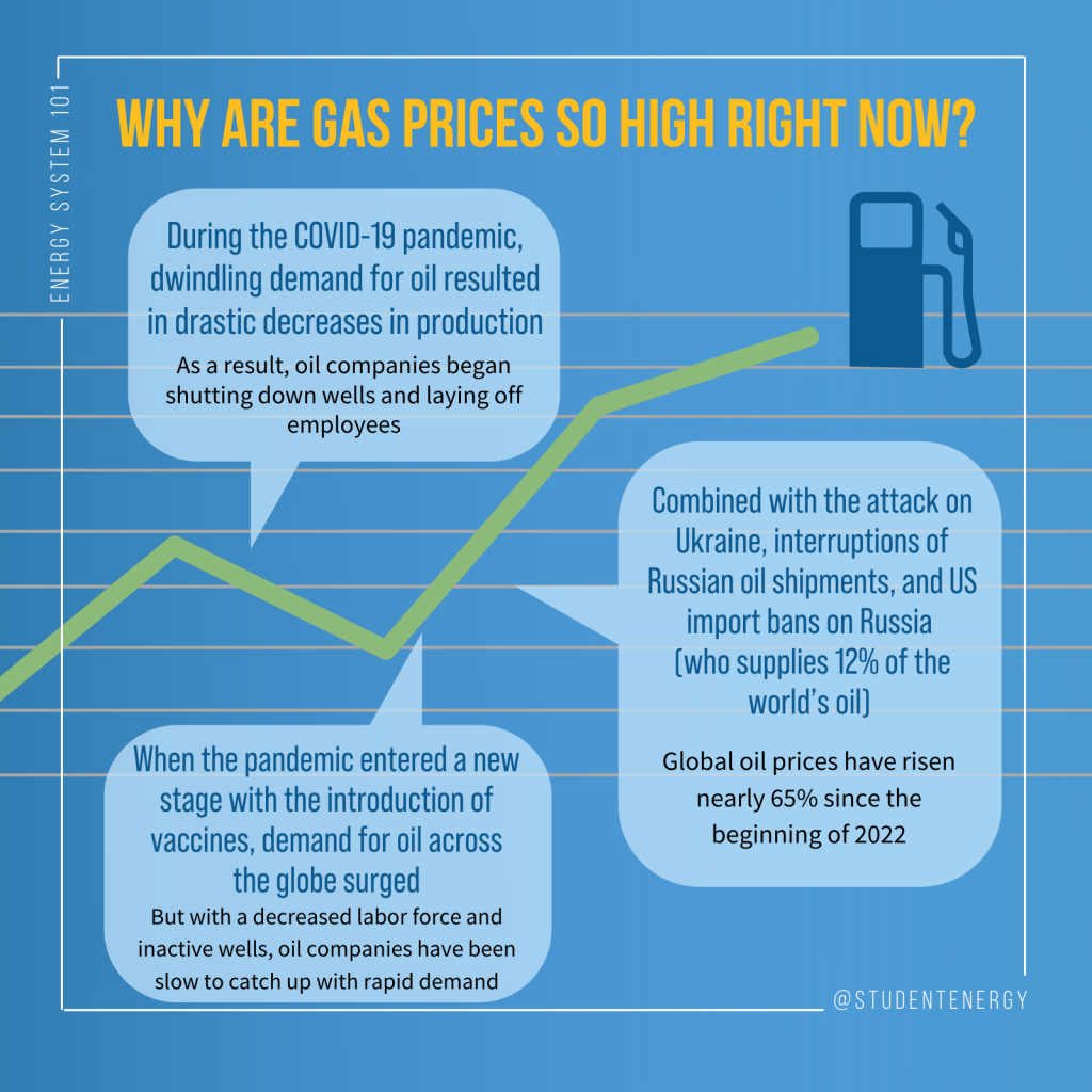 During the COVID-19 pandemic, dwindling demand for oil resulted in drastic decreases in production. As a result, oil companies began shutting down wells and laying off employees. However, as the pandemic entered a new stage with the introduction of vaccines, demand for oil across the globe surged – but with a decreased labor force and inactive wells, oil companies have been slow to catch up with the rapid demand for gasoline. Combined with the attack on Ukraine, interruptions of Russian oil shipments, and US import bans on Russia (who supplies 12% of the world’s oil) global oil prices have risen nearly 65% since the beginning of 2022.