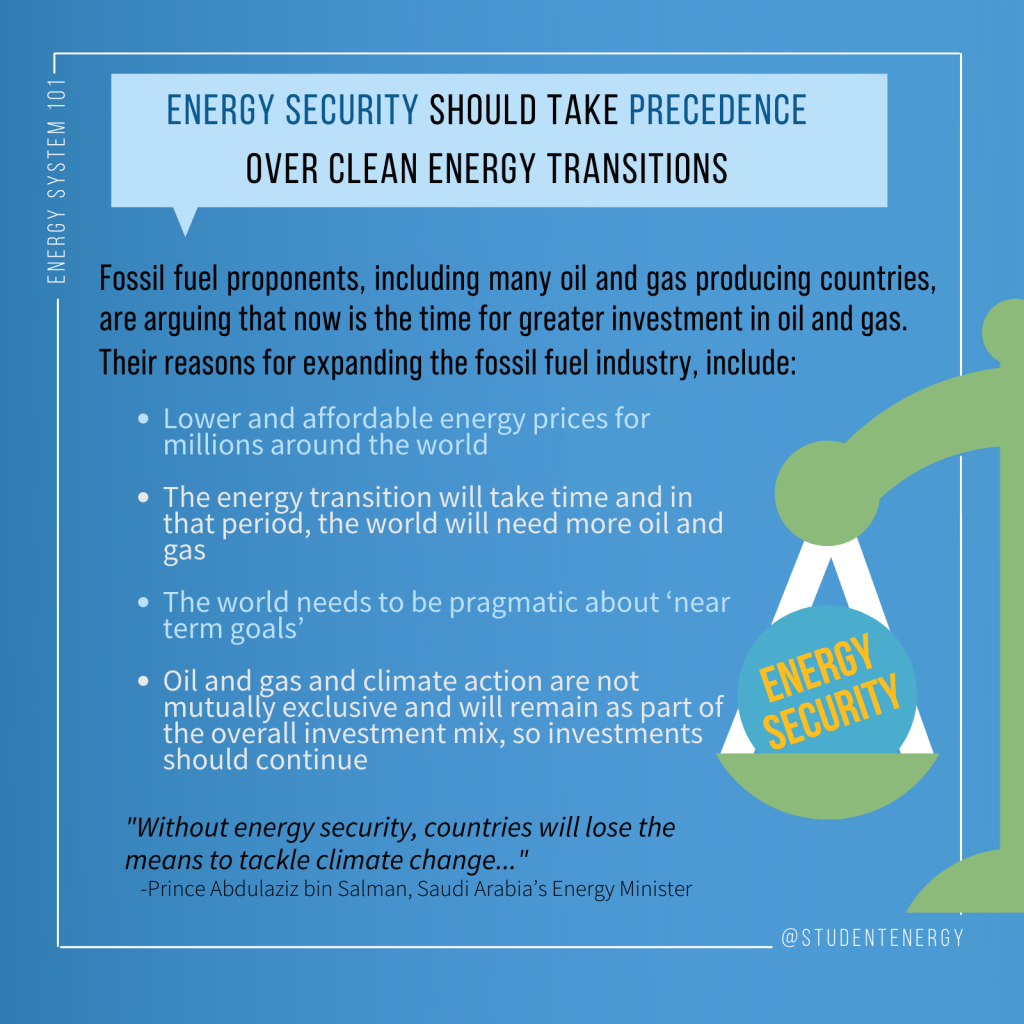 Fossil fuel proponents, including many oil and gas producing countries, argue that now is the time for greater investment in oil and gas. Supporters are highlighting several reasons for expansion of the fossil fuel industry, including: