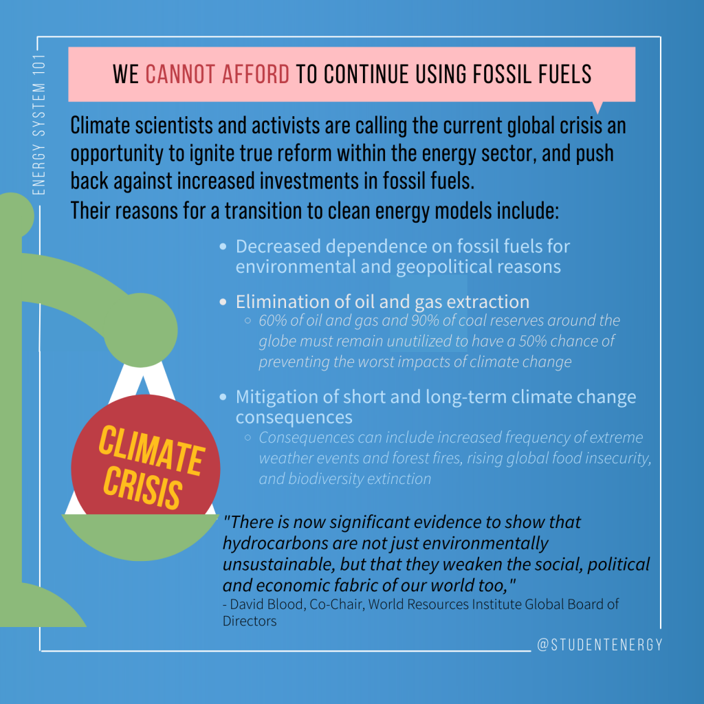 Without transition to clean energy, the devastating impacts of climate change such as increased frequency of extreme weather events and forest fires, rising global food insecurity, and biodiversity extinction will continue to have vast impacts on society and the planet. According to the Unextractable Fossil Fuels in a 1.5°C World, released in September 2021, 60% of oil and gas and 90% of coal reserves around the worst must remain underground and unutilized to have a 50% chance of preventing the worst impacts of climate change. Additionally, the report also estimates that global oil and gas production must decline by 3% annually until 2050.
