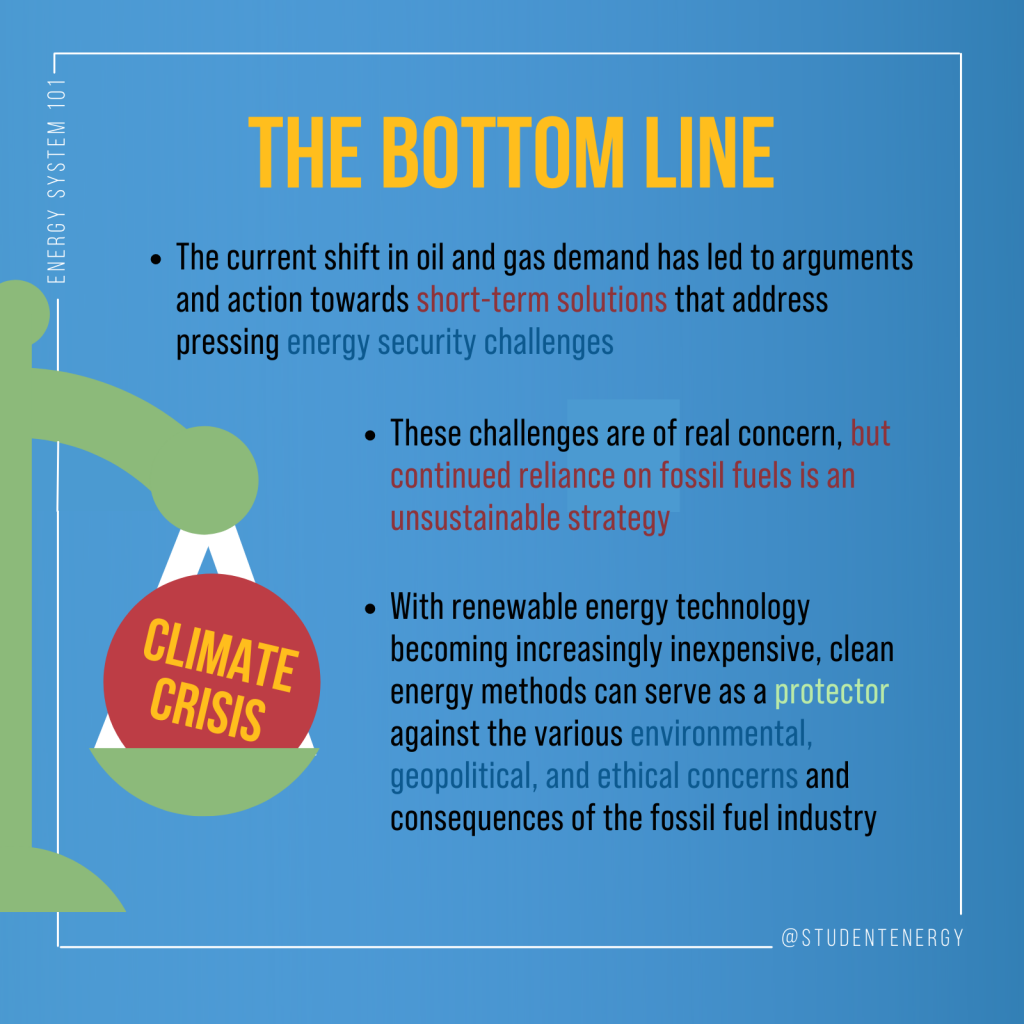 The current shift in oil and gas demand has led to arguments and action towards short-term solutions that address pressing energy security challenges. Although these challenges are of real concern and cause significant disadvantages for large portions of the global population, continued reliance on fossil fuels is an unsustainable strategy – especially with its well-known environmental, and rising geopolitical and ethical concerns. With renewable energy technology becoming increasingly inexpensive, clean energy methods can serve as a protector against the multifaceted concerns and consequences of the fossil fuel industry; and the pressure of the climate emergency intertwined with recent energy crises only demonstrates how transitions to clean energy systems are critical now more than ever before.